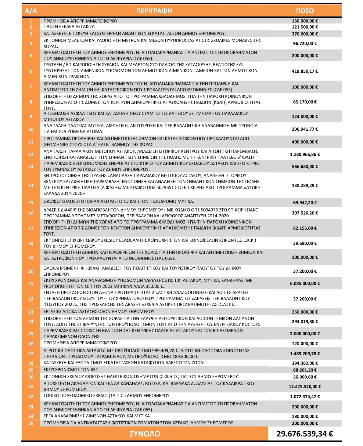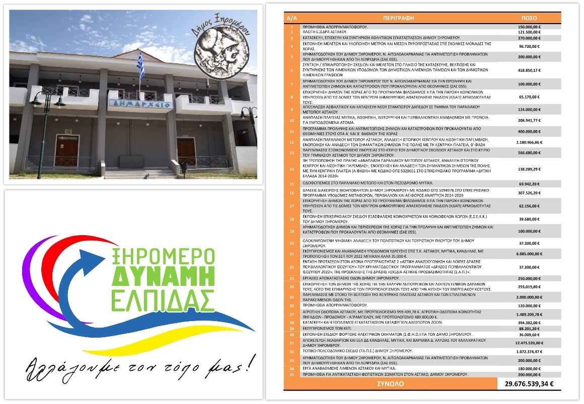 Εξασφαλίσαμε έως σήμερα 35 μεγάλες νέες χρηματοδοτήσεις, συνολικού ποσού 29.676.539,34 €. Το συγκεκριμένο ποσό είναι ρεκόρ στην ιστορία του Δήμου Ξηρομέρου. Όλες αυτές οι χρηματοδοτήσεις, έχουν με επίσημα έγγραφα, ημερομηνία ένταξης στα αντίστοιχα χρηματοδοτικά εργαλεία, την περίοδο που την ευθύνη διοίκησης του Δήμου έχει η παρούσα δημοτική αρχή.
